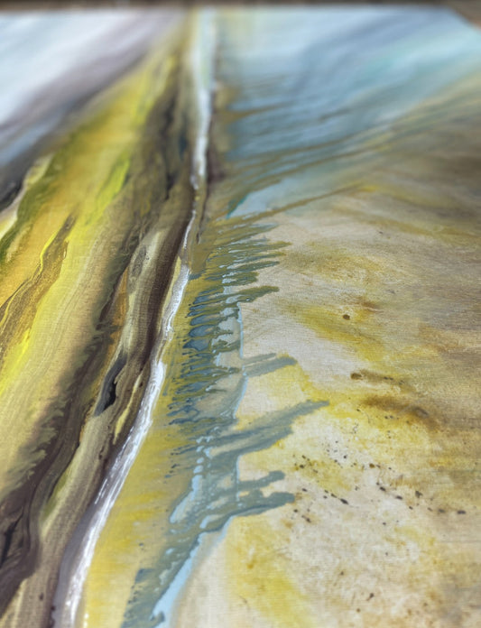 These paintings are the result of sometimes the feeling of being out of sight of the land on the sea, on a boat. Sometimes absolute terror and sometimes absolute joy, the feeling of being out in the open ocean and completely powerless to control natures choice of mood. This is also a sense of this body of water underneath us connecting to the entire planet, a gateway to boundless adventures. Sometimes from the safety of the dunes, glad to no longer be part of the natures magical cauldron.