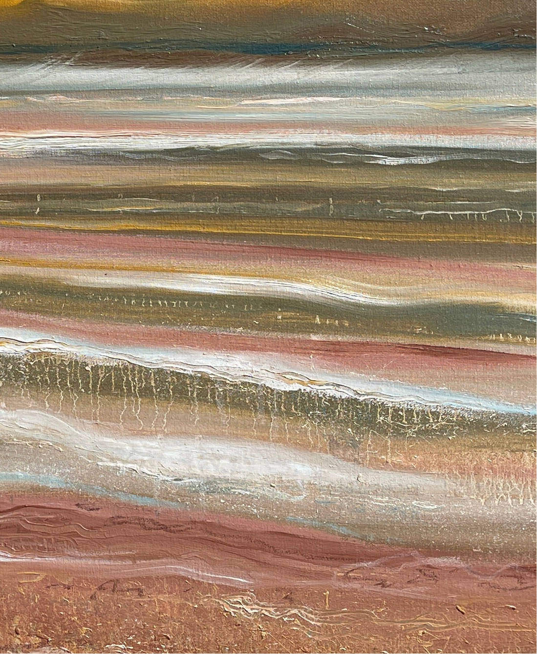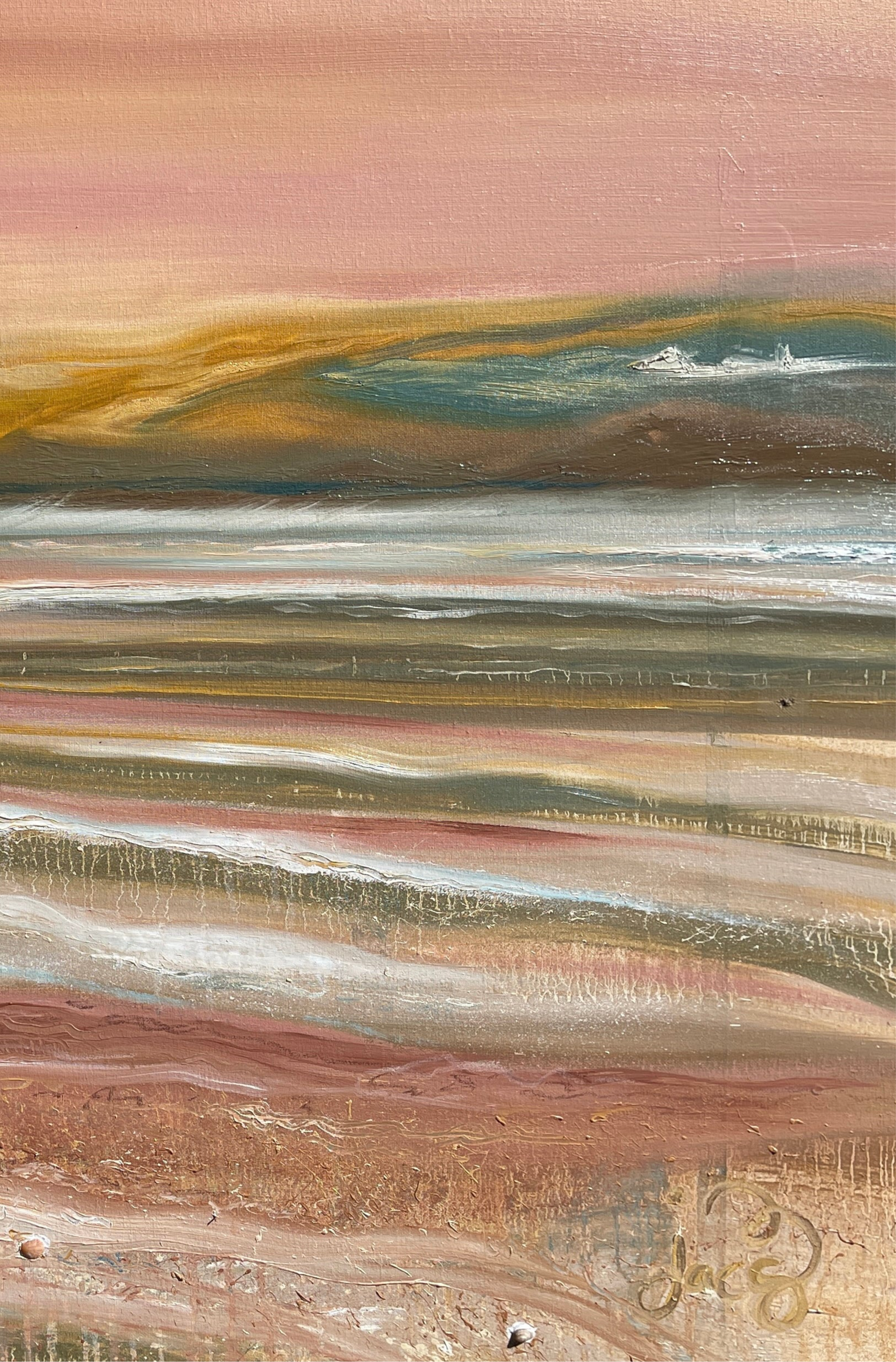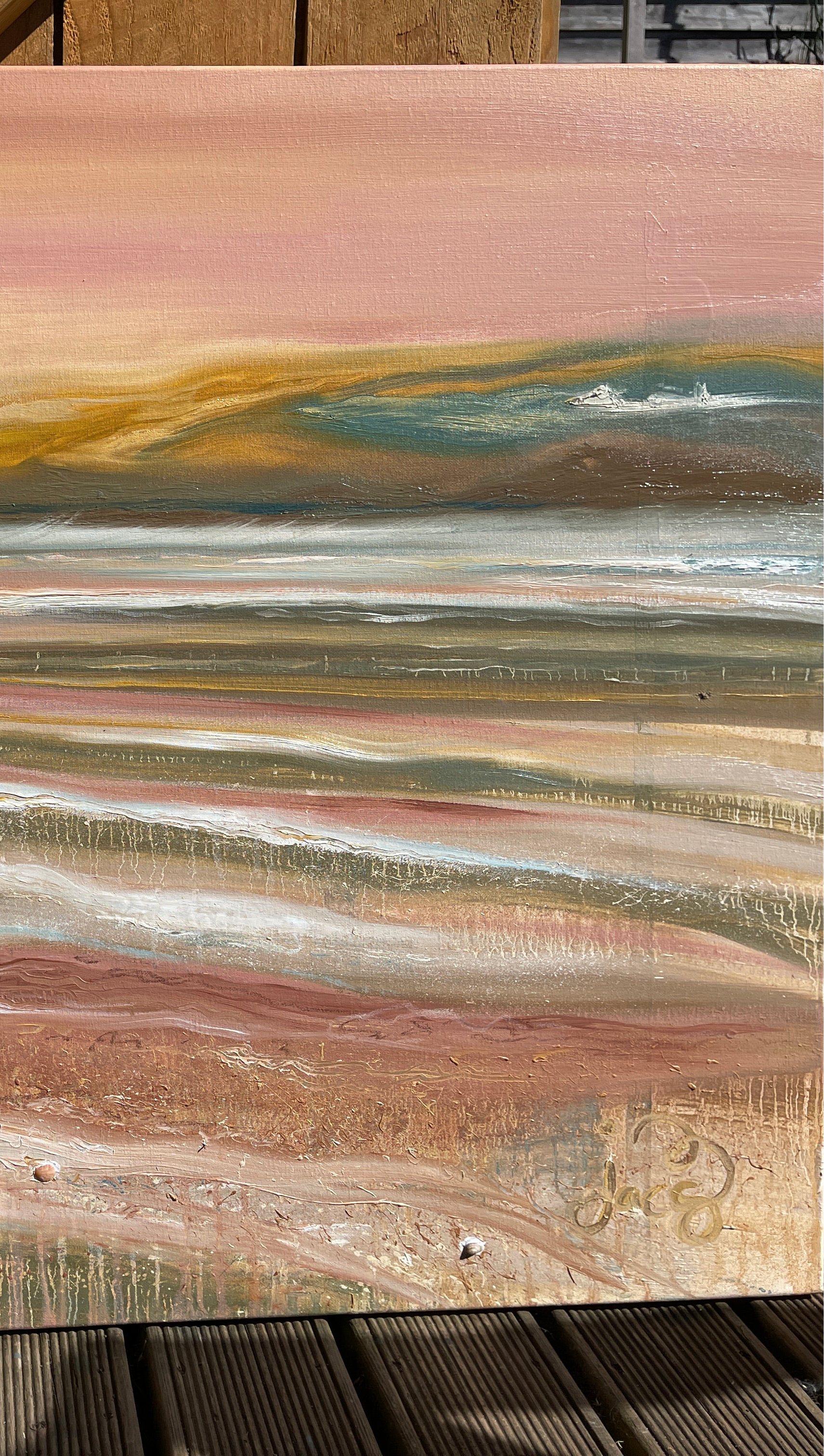 The palette is built around warm blushes, terracotta, and soft amber, layered with textured brushwork to reflect the way light pools across wet sand. The headland, still in shadow, gives contrast to the brilliance of the sky, reminding me of how the land slowly wakes before the sea.